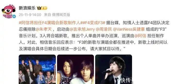 到了11月9号,F4官方直接把成员改成三个人,让言承旭、周渝民、吴建豪继续参加巡演,制作人还是阿信,朱孝天的名字被去掉了,这不是私下闹矛盾,是公司开会决定的,因为朱孝天之前直播时经常乱说话,提前透露合体细节和新专辑计划,导致项目没办法推进,公司只能把他移出去,避免再带来麻烦。